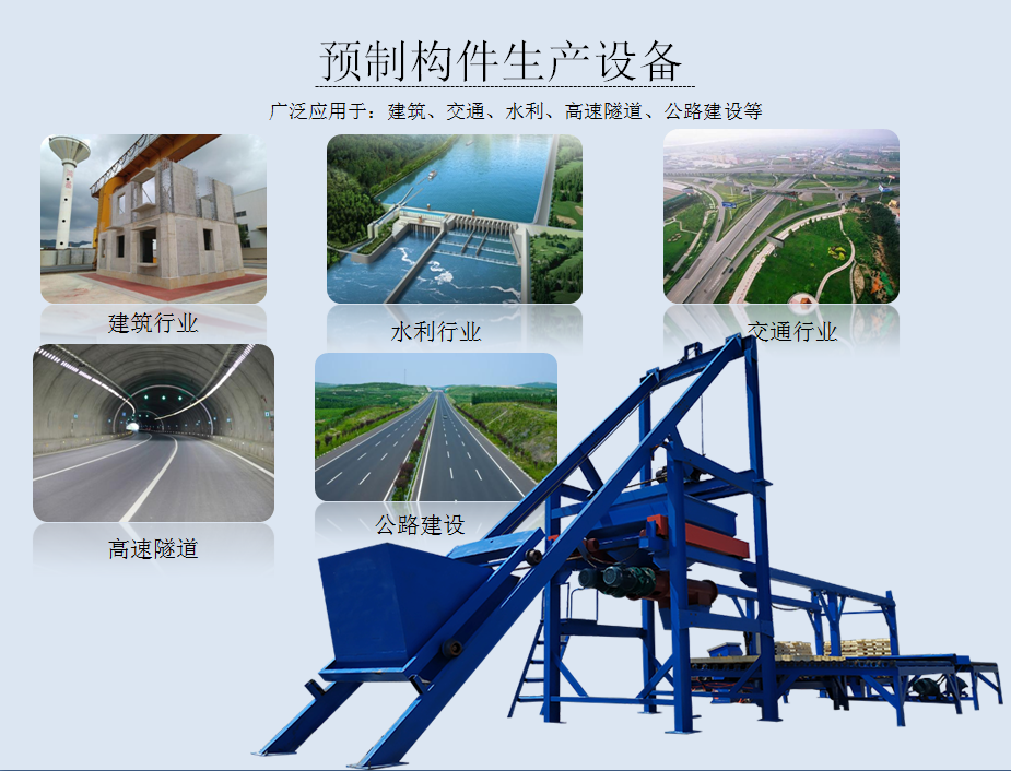 對生產條件要求不高,面積小,生產中無廢水、廢渣、廢氣,噪音小,符合環保要求。 技術用途廣,可定制功能生產預制塊,打破人工生產的低效率,實現了構件生產的自動化,智能化,且克服了構件表面的氣孔,接縫等毛病。