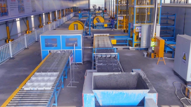 生產線分為混凝土布料區、自動升降上架區、智能溫控蒸養區、自動升降下架區、自動脫模區、機器人自動碼垛區、空模板回流循環區七大區域。生產線通過各項自動化設備及完整的生產流程,實現了流水線整體閉環,具有較大的經濟效益和良好的社會影響。